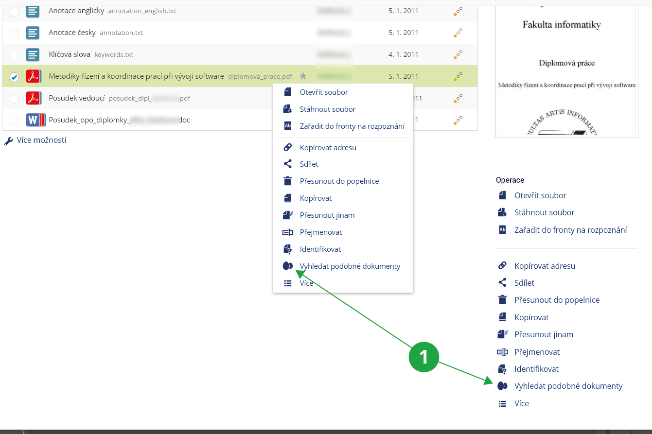 Potom použijte operaci „Vyhledat podobné dokumenty“ (ikona dvou vajíček „podobných jako vejce vejci“), podrobněji v otázce Jak se odhalují podobnosti textu (podezření na plagiát) v IS VŠHCR?