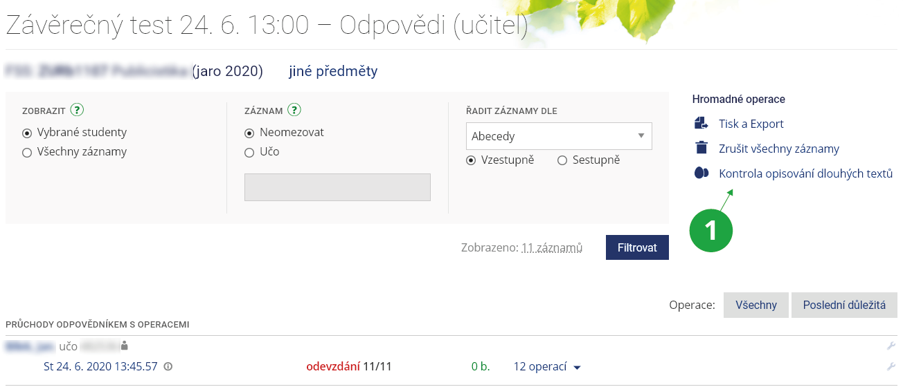 Zobrazí se jednotlivé soubory, jména studentů a procento podobnosti.1 Zde je možné zkontrolovat najednou odpovědi v celé odevzdávárně.