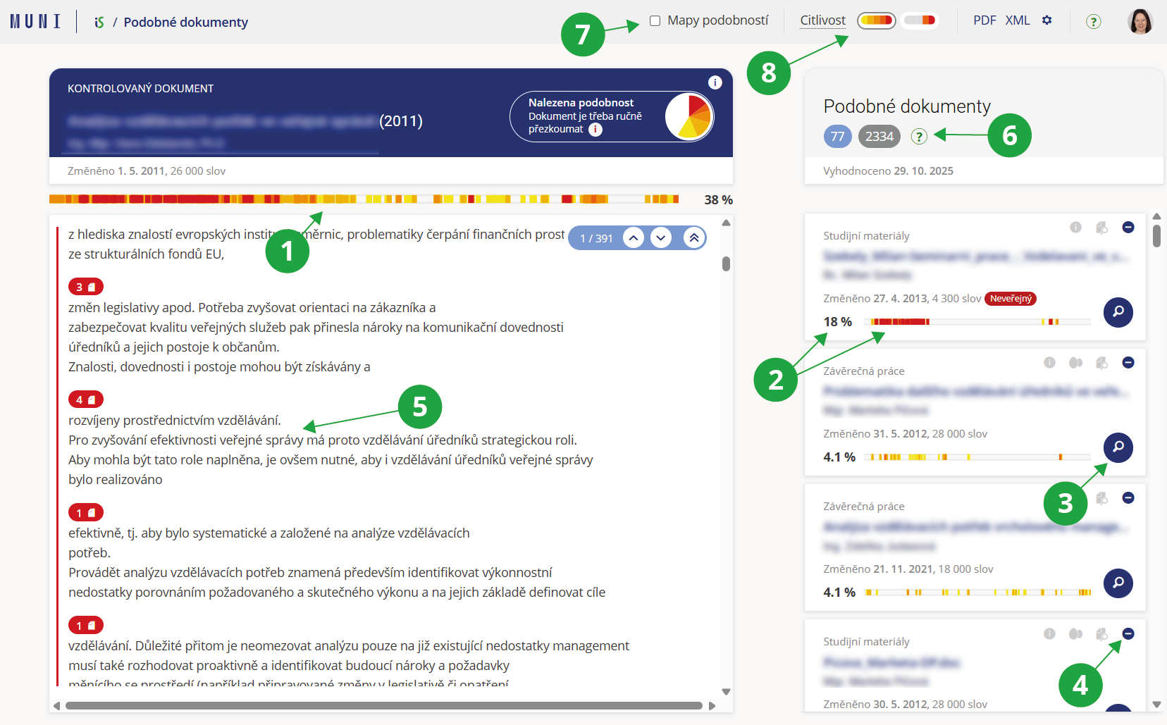 - Uživateli se zobrazí ty nejvíce relevantní dokumenty, u kterých dochází k významné podobnosti s hledaným dokumentem, a procento míry této podobnosti.