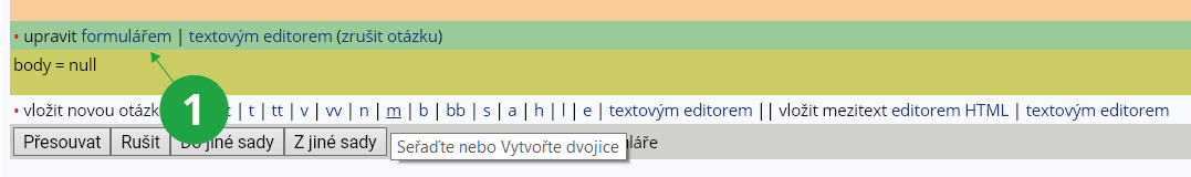 Otázku můžete později ještě měnit a upravovat. V zeleném řádku klikněte na „upravit formulářem“, proveďte změny a uložte. Volba „textovým editorem“ je určena pro pokročilé uživatele, kteří ovládají značky pro vytváření otázek v textovém formátu.