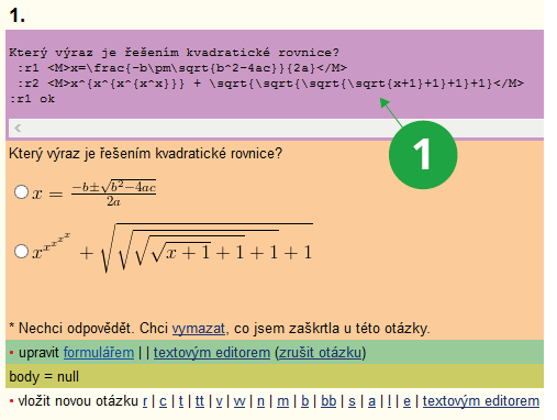 • U :r otázek je třeba přepsat číslo za označením :r na to, které označuje správnou odpověď. Za správnou může být vždy označena pouze jedna. V případě chybného obodování je třeba upravit počet bodů na konci řádku (za značkou „ok“).