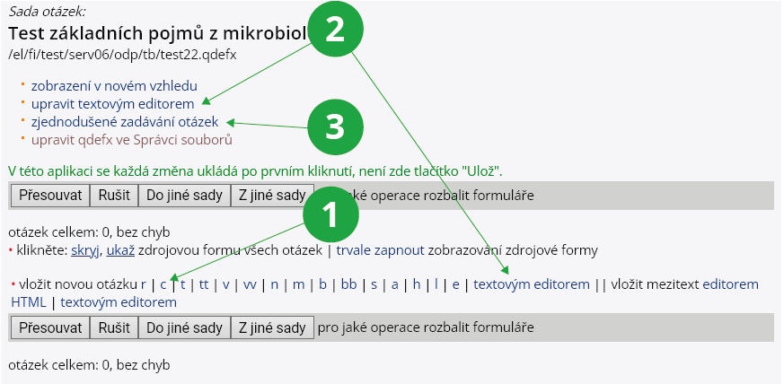 • Celou sadu či jednotlivé otázky lze upravit textovým editorem.