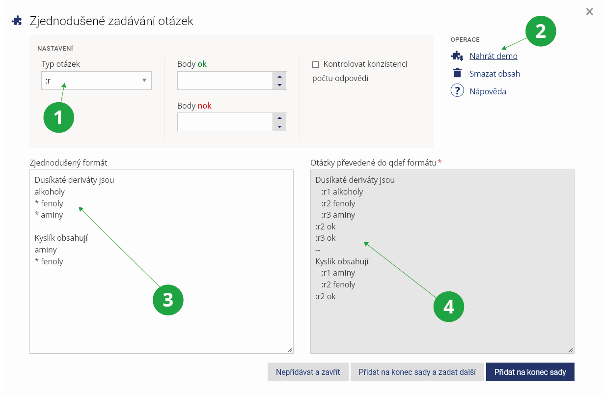 Operace „Nahrát demo“ kdykoli zobrazí vzor, jak mají být vkládány otázky daného typu. Pro otázky typu :r, :c platí: