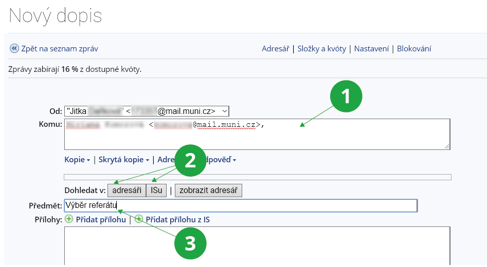 Dále otevřete ve svém počítači soubor s čísly učo obesílaných osob, sloupec čísel zkopírujte (např. Ctrl+C) a vložte (Ctrl+V) do pole „Komu:“ (pokud chcete, aby adresáty všichni příjemci dopisu viděli) nebo do pole „Skrytá kopie:“ (pokud chcete, aby se adresáti navzájem neviděli). Vepište text dopisu, přiložte přílohy a dopis obvyklým způsobem odešlete.
