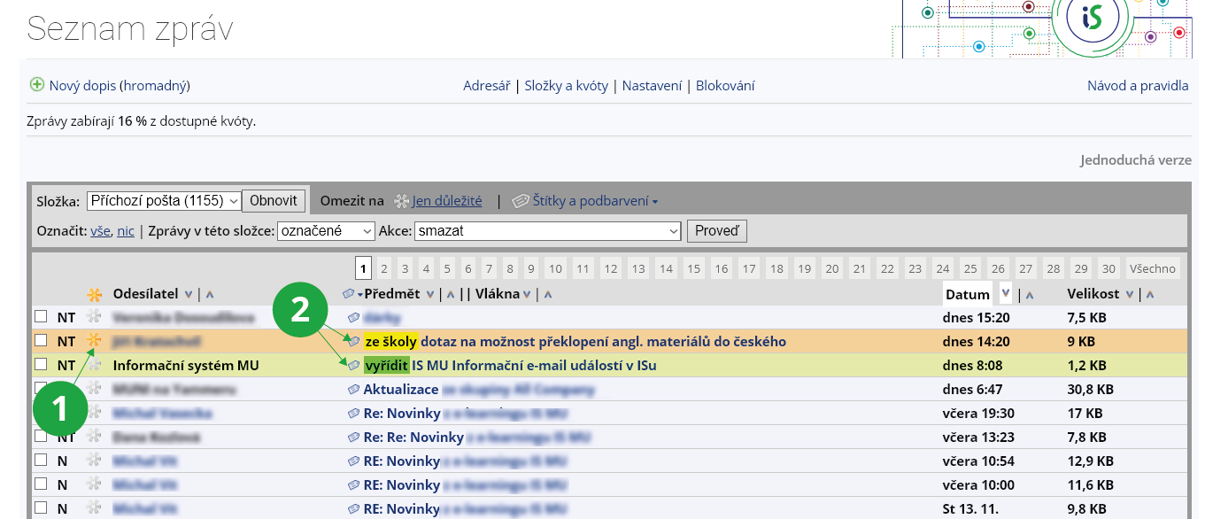 Zprávy lze označit (checkbox) a přečíst jich více naráz, případně je smazat, stáhnout na lokální disk počítače, přesunout do jiné složky apod. Jednotlivé zprávy lze označit hvězdičkou (jako důležité), přidat jim štítek nebo podbarvení. Přes volbu „Správa štítků“ (zobrazuje se v okně při přidávání štítků) si můžete přidat vlastní štítky nebo přejmenovat ty stávající.