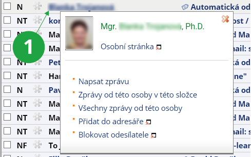 1 Kliknutím na zvýrazněné jméno se objeví vizitka s rychlými volbami.