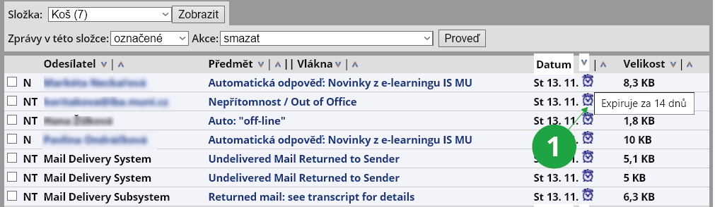 Dopisům přesunutým do koše je nastavena expirace 14 dní, po uplynutí této doby se dopisy automaticky smažou. U zpráv, kterým zbývá do expirace méně než 14 dní, se zobrazuje budík (vedle data přijetí zprávy). Najetím myši na symbol budíku zjistíte, kolik dnů zbývá do expirace zprávy.