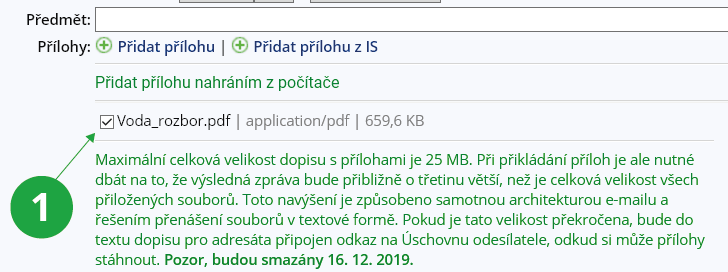 Maximální celková velikost dopisu s přílohami je 25 MB. Při přikládání příloh je ale nutné dbát na to, že výsledná zpráva bude přibližně o třetinu větší, než je celková velikost všech přiložených souborů. Toto navýšení je způsobeno samotnou architekturou e-mailu a řešením přenášení souborů v textové formě. Pokud je tato velikost překročena, bude do textu dopisu pro adresáta připojen odkaz na Úschovnu odesílatele, odkud si může přílohy stáhnout. V Úschovně platí 30denní expirační lhůta – při odesílání dopisu se objeví datum, kdy budou přílohy z Úschovny odesílatele smazány (než dojde k úplnému smazání, jsou přílohy dalších 30 dní dostupné v Úschovně ve složce Popelnice).