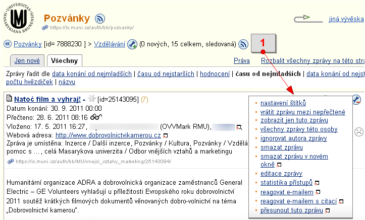 Nabídne možnosti operace s příspěvkem - např. reagovat e-mailem, upravit zprávu, zobrazit všechny zprávy osoby apod.