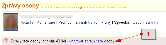 Vyberete-li si v seznamech další osobu, jejíž zprávy ignorují jiní uživatelé, vstoupíte na seznam jejích zpráv na vývěskách. Pro přidání osoby do vašeho seznamu ignorovaných osob klikněte na nabízenou možnost 'Ignorovat zprávy této osoby'.