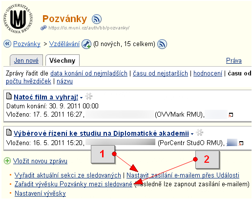 Na konci stránky pod vybranou Vývěskou/sekcí zvolte pro sledování celé konkrétní Vývěsky 'Zařadit vývěsku mezi sledované' nebo pro sledování pouze určité sekce 'Zařadit aktuální sekci do sledovaných'. Poté se objeví odkaz 'Nastavit zasílání e-mailem přes Události', kterým vstoupíte do nastavení zasílání informačního e-mailu.