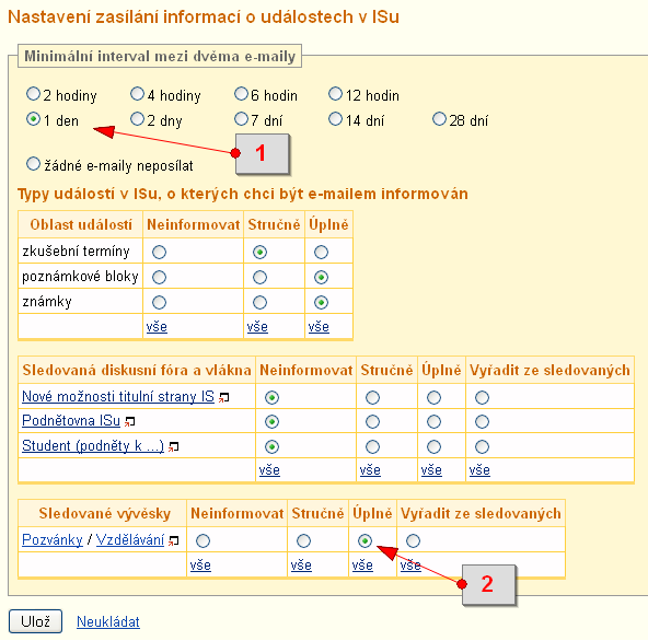 V nastavení zvolte interval, ve kterém chcete dostávat informační e-maily o nových zprávách (minimálně lze 2 hodiny) a u sledovaných vývěsek/sekcí vyberte, v jakém formátu se mají informace posílat. Pro detailní výpis včetně textu nových zpráv označte políčko ve sloupci "Úplně".