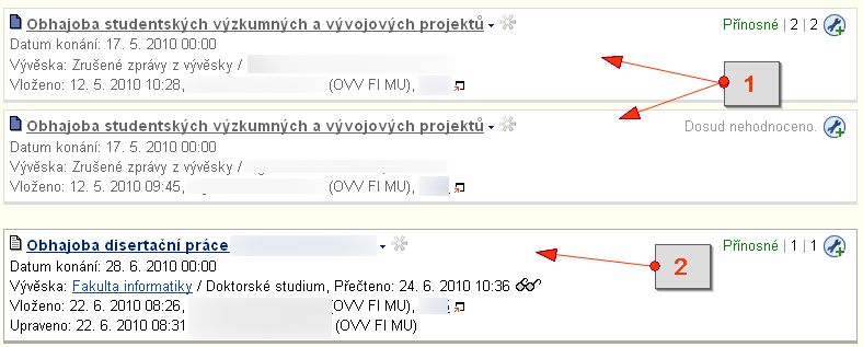 Na Hlavních vývěskách se poznačuje přečtenost zprávy až po jejím přečtení, na vývěskách Pozvánky/Inzerce se přečtenost poznačuje už při zobrazení seznamu sbalených zpráv.