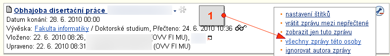 Konkrétní zprávu lze vrátit zpět mezi nepřečtené - buď přímo v 'Přehled mých čtení vývěsky' nebo v pravém horním rohu zprávy na kterékoli vývěsce klikněte na ikonu manipulačního klíče a z nabídky vyberte 'vrátit zprávu mezi nepřečtené'.