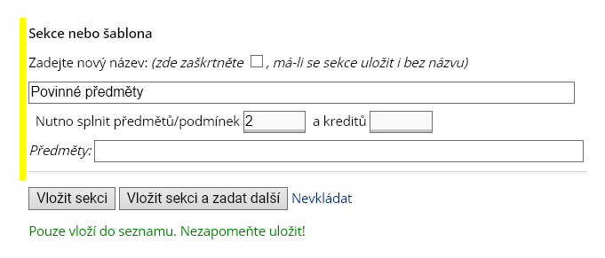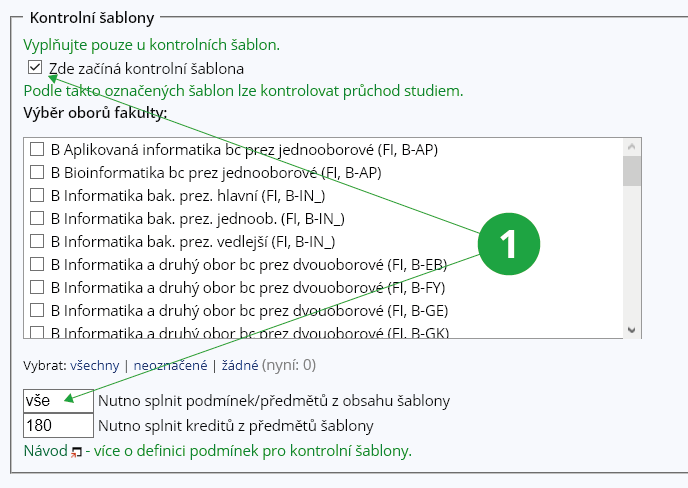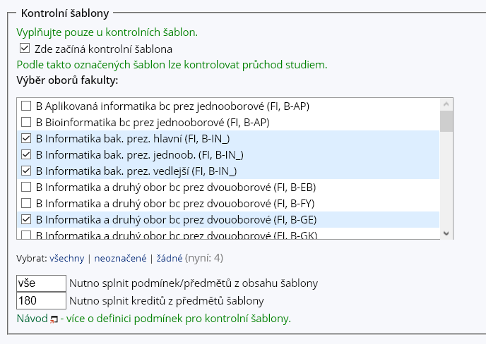 • Kolik je v rámci sekce třeba úspěšně absolvovat předmětů (v Plnění šablon zadejte číslem, nebo vepište „vše“ ci „vse“, např. u seznamu povinných předmětů).