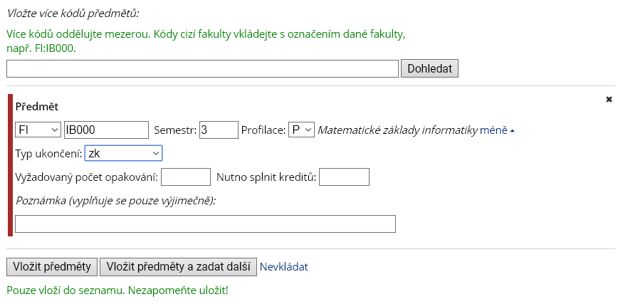 Předměty je možné vkládat jednotlivě nebo hromadně (pomocí kódů předmětů oddělených mezerou). Změny je potřeba uložit.