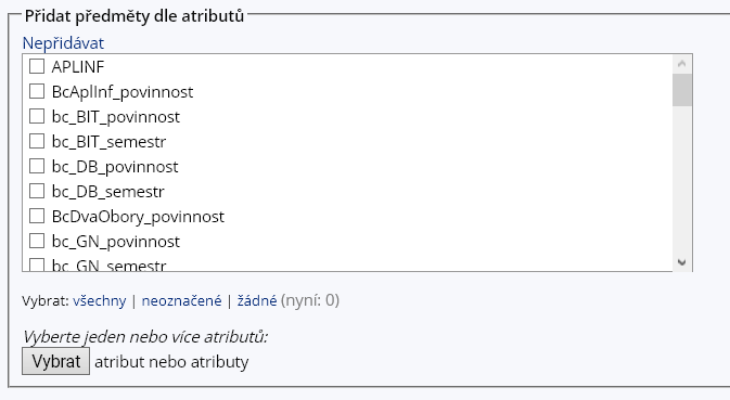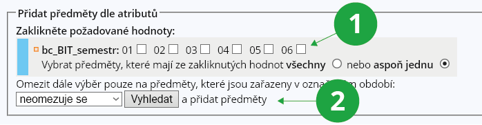 Dále je možno upřesnit, dle kterých hodnot atributů předměty vybírat nebo ve kterých obdobích předměty s atributem vyhledávat.