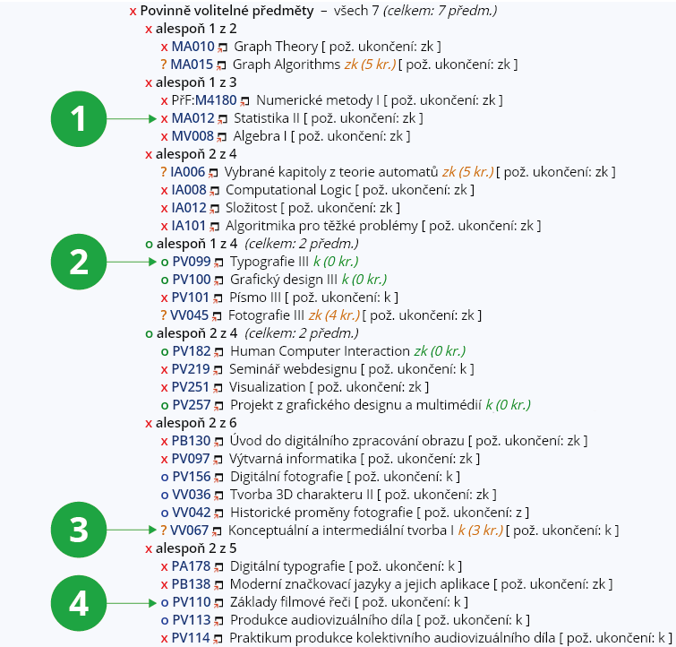 4 Modrá kolečka označují předměty splněné se stejným nebo vyšším typem ukončení ve vašem jiném studiu.