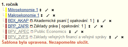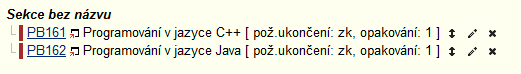 Vedle každé sekce či předmětu se nachází tři ikonky. První ikonka slouží k přesunu sekce/předmětu v rámci úrovně, prostřední ikonka k editaci vybrané položky a křížek ke smazání sekce/předmětu.