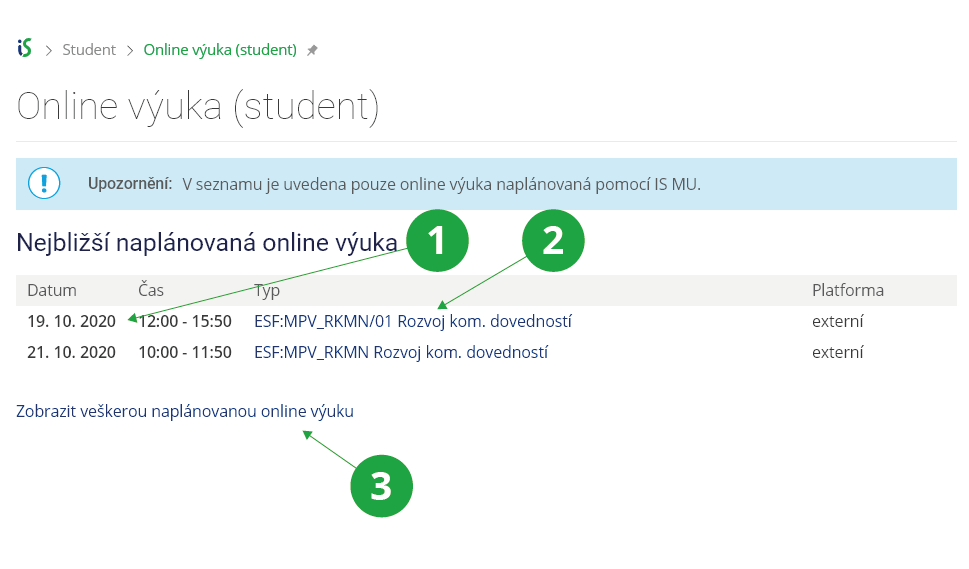 Takto se zobrazí pouze výuka, která je naplánovaná za pomoci IS VŠHCR a nebo výuka v jiných externích systémech, kterou vyučující ručně zadal do aplikace k online výuce. Může se stát, že výuka bude probíhat ve videokonferenčním systému, ale IS VŠHCR o ní nebyl informován. Vždy by pro studenta měly být stěžejní informace, které mu o organizaci předmětu sdělí přímo jeho učitel (například e-mailem s instrukcemi na začátku výuky nebo za pomoci interativní osnovy).