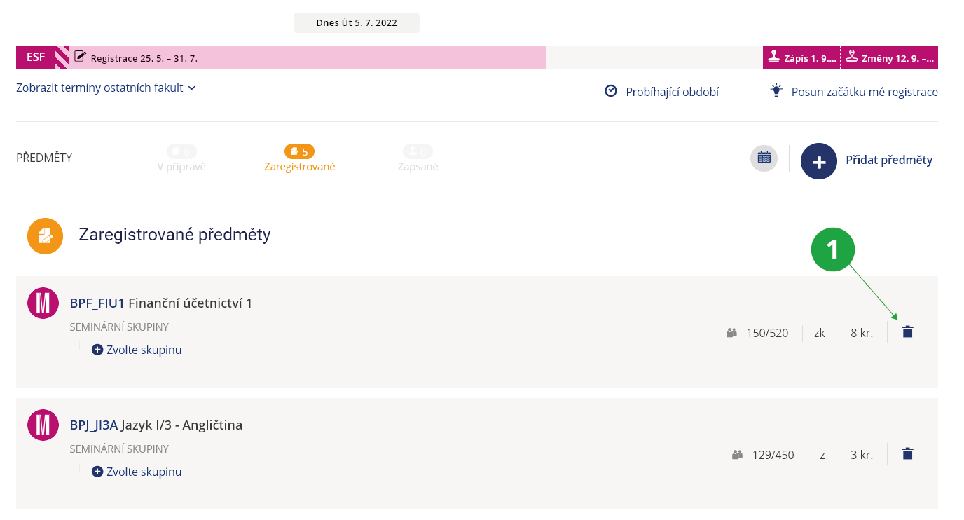 1 Pokud probíhá období, kdy lze předmět zrušit, zobrazuje se u něho modrá (aktivní) ikona popelnice.