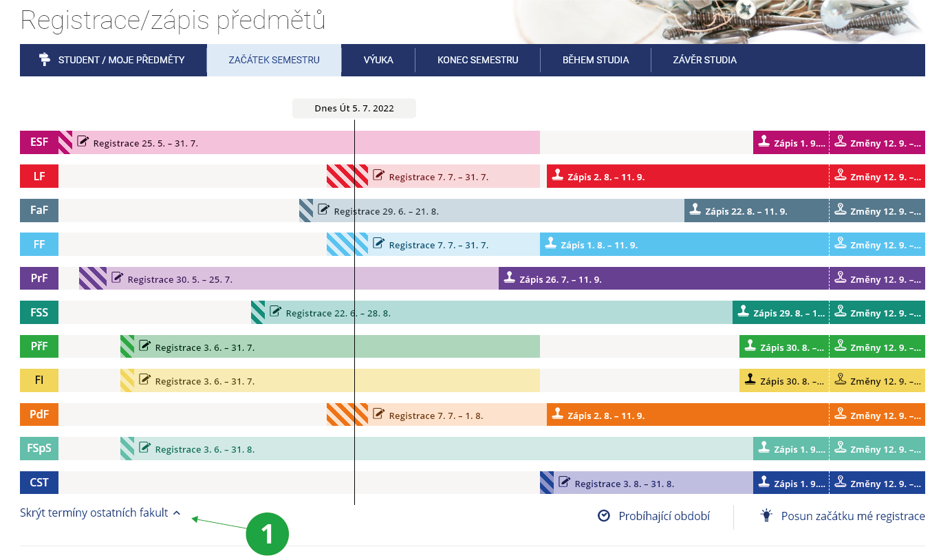 Zde najdete grafické znázornění období registrace, zápisu a změn v zápisu na své fakultě. Po rozkliknutí barevného řádku se zobrazí podrobnější informace, včetně informací o posunutí začátku registrace předmětů.