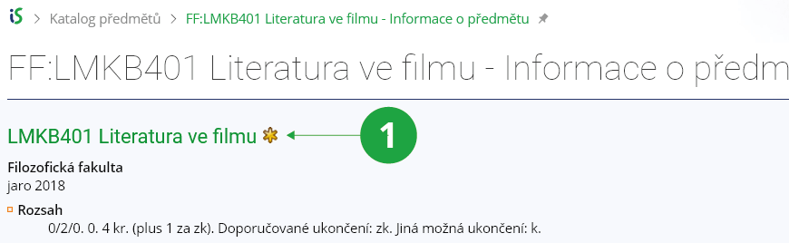 - 12.Mohu si označit zajímavé předměty?Ano, libovolné předměty v „Katalogu předmětů“ si můžete označit hvězdičkou po kliknutí na kód předmětu, kterým se zobrazí podrobné informace. Hvězdičku naleznete vedle názvu předmětu a jejím označením si předmět přidáte mezi oblíbené. Předměty si můžete označit i v dalších aplikacích, blíže viz Nápověda.