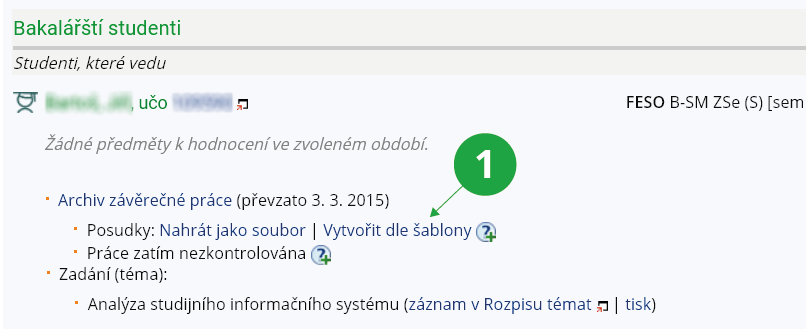 Zde si vyberte studenta, k jehož práci chcete vyplnit posudek a klikněte na „Vytvořit posudek dle šablony“.
