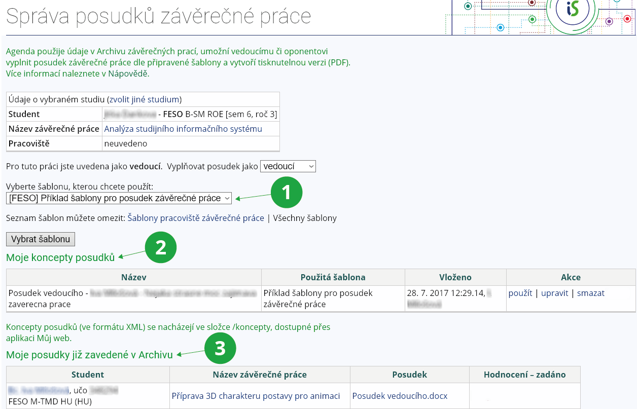 Vkládání posudků prostřednictvím šablon je dobrovolné, pokud nebudete chtít plnění posudků přes IS využívat, můžete do Archivu závěrečných prací vložit jakýkoli svůj posudek. Více o vkládání posudků v nápovědě Závěrečná práce – povinnosti vedoucího.