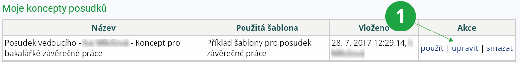 Vaše koncepty najdete v sekci „Moje koncepty posudků“, nachází se také ve složce /koncepty, dostupné přes aplikaci Můj web (ve formátu XML). Pokud chcete použít šablonu konceptu (i s předvyplněnými údaji) klikněte na možnost „použít“. Pro úpravu stávajícího konceptu posudku, klikněte na možnost „upravit“. Možnost předvyplnit šablonu údaji některého ze starších posudků se vám nabídne také pokud si z nabídky šablon vyberete již jednou použitou (a uloženou) šablonu.