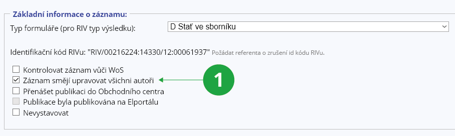 Aby ostatní autoři nemohli záznam modifikovat, lze zrušit povolení editace pro ostatní autory v editačním formuláři publikace. Povolení editace ostatním
