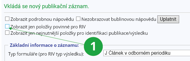 Pracujete-li s aplikací poprvé, zatrhněte na začátku stránky „Zobrazit podrobnou nápovědu“ a klikněte na „Uplatnit“. Do formuláře se vypíše podrobný zelený návodek, který upřesní, jak vložit publikaci. Formulář pro vložení publikace můžete omezit na nejnutnější položky volbou „Zobrazit jen nejnutnější položky pro identifikaci výsledku“. Vkládáte-li publikaci, která se bude přenášet do RIV, zvolte „Zobrazit jen položky povinné pro RIV“. Po vybrání některé z položek (i více najednou) na začátku formuláře vždy zvolte „Uplatnit“.1 Vložení nového publikačního záznamu.