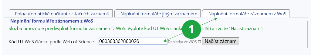 Pro předvyplnění formuláře je třeba vyplnit identifikační kód článku, tzv. UT WoS kód, a záznam načíst.