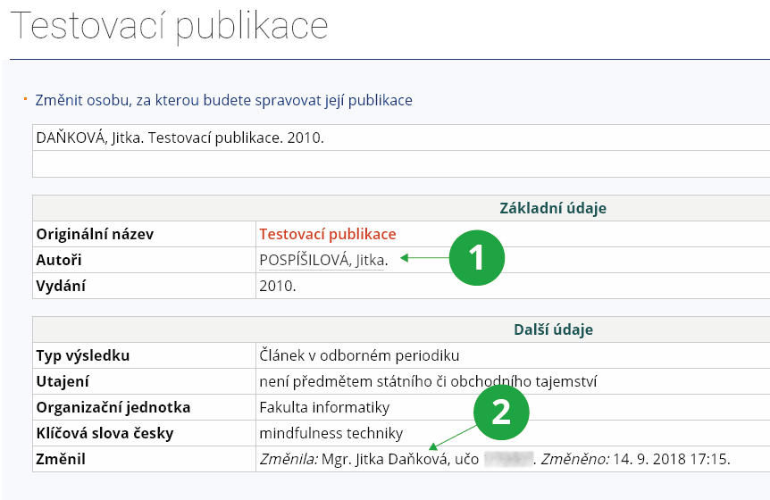 - Upravovat (tj. měnit název, autory, vydavatele atd.) nebo smazat záznam smí každá osoba, která je uvedena mezi autory publikace, pokud je