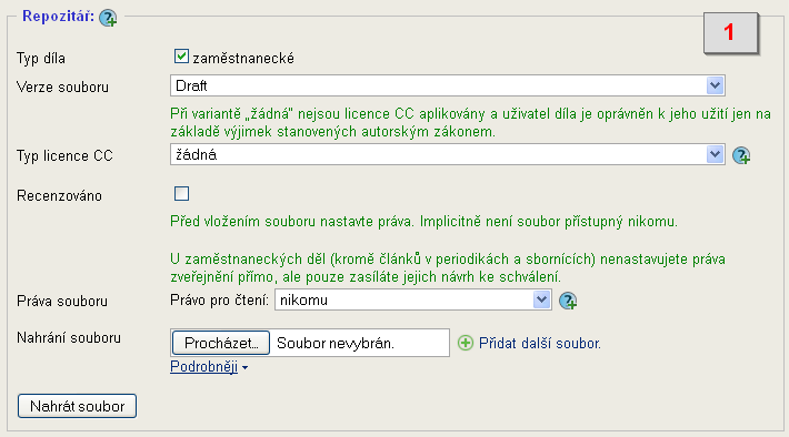- 11.Jak nastavím míru zpřístupnění vkládaného souboru?Míra zpřístupnění přiložených souborů se nastavuje pomocí přístupových práv k jednotlivým souborům. Práva určují, komu bude možné soubor přiložený k publikačnímu záznamu zobrazit. Před vkládáním souboru do repozitáře vyberte vhodný typ práva a příp. k němu zvolte upřesnění (například pracoviště, jehož pracovníci smí text číst, nebo UČO osoby). Jednotlivé typy práv i upřesnění je možné kombinovat (tj. soubor lze zpřístupnit např. studentům více různých předmětů a současně zaměstnancům z více pracovišť apod.). U každého práva je také možné určit časové embargo (tj. termín, od kdy bude zvolené právo uplatněno). Zvolená práva musí potvrdit pověřená osoba, do té doby soubory nebudou zpřístupněny. Podrobnější informace k nastavování přístupových práv k souborům najdete v této Nápovědě.