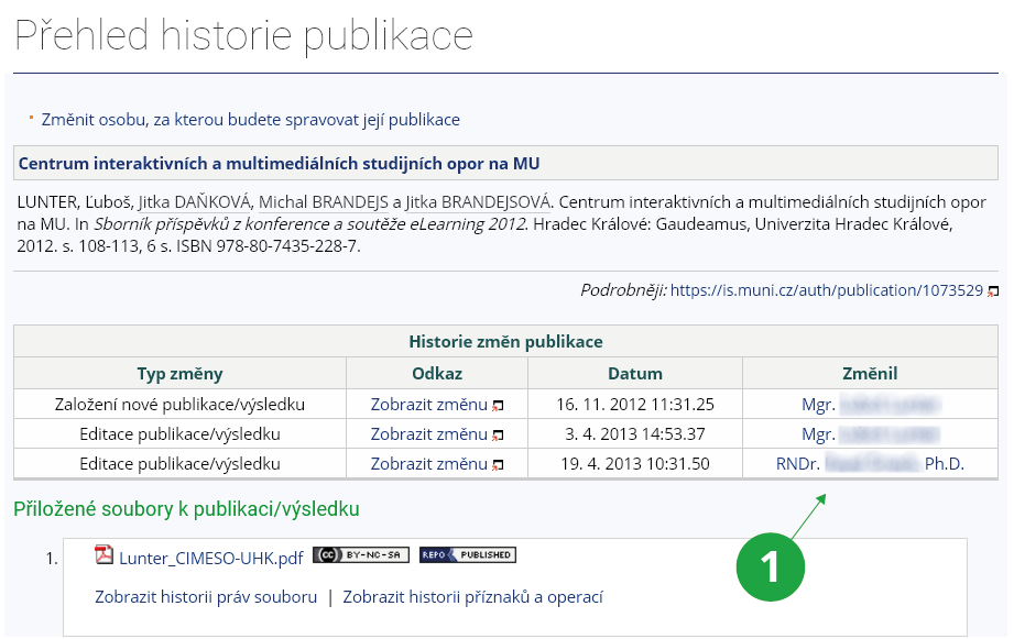 V tabulce jsou uvedeny změny publikace učiněné ve formuláři pro zadávání publikace/výsledku. Pod tabulkou jsou uvedeny všechny soubory přiložené k publikaci/výsledku, a to jak aktuálně zavedené, tak již smazané. U souborů lze získat podrobnější informace rozkliknutím odkazů „Zobrazit historii práv souboru“ a „Zobrazit historii příznaků a operací“.1 Zobrazení historie publikace.