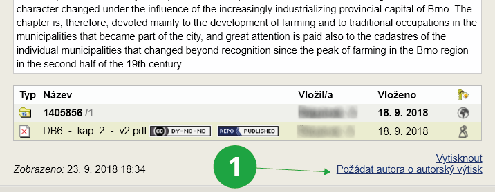 - 14.Jak požádám o zpřístupnění vložených souborů?Pokud nemáte přístup k souborům přiloženým k vybrané publikaci, můžete požádat o autorský výtisk. Žádosti mohou podávat i osoby mimo IS. O podání žádosti bude autor publikace, případně vykonavatel majetkových práv, informován e-mailem.