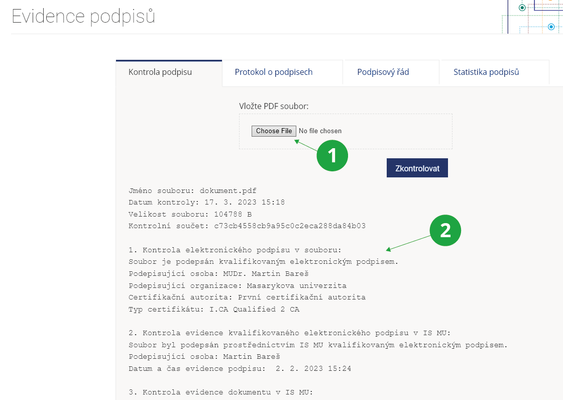 1 Do aplikace Evidence podpisů lze nahrát podepsaný soubor ke kontrole pravosti podpisu.