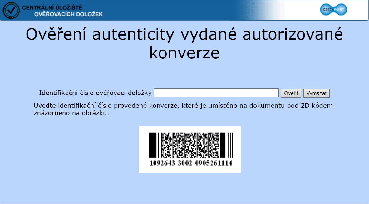Na výše uvedené stránce je možné ověřit dokument, který vznikl provedením konverze. Pro kontrolu je nutné zadat číslo provedené konverze do pole Identifikační číslo ověřovací doložky.