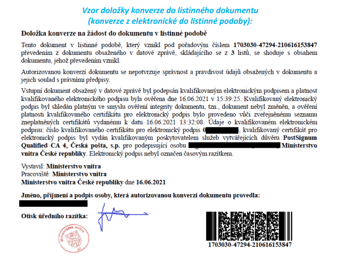 1 Vzor doložky konverze do listinného dokumentu (konverze z elektronické do listinné podoby). Převzato z dokumentu "Konverze elektronických a listinných dokumentů", Ministerstvo vnitra České republiky, Praha, 2022 (https://www.mvcr.cz/soubor/konverze-elektronickych-a-listinnych-dokumentu-prakticky-pruvodce-a-radce-urednika.aspx)